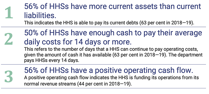 Five of 16 HHSs failed to meet all three of our better practice financial benchmarks (see Figure 4C) in 2019–20 (refer to Appendix H for a more detailed explanation of our financial benchmarks). These provide insights into the financial sustainability of the HHSs. Four of the five are from the rural and remote or other regional HHS groups.